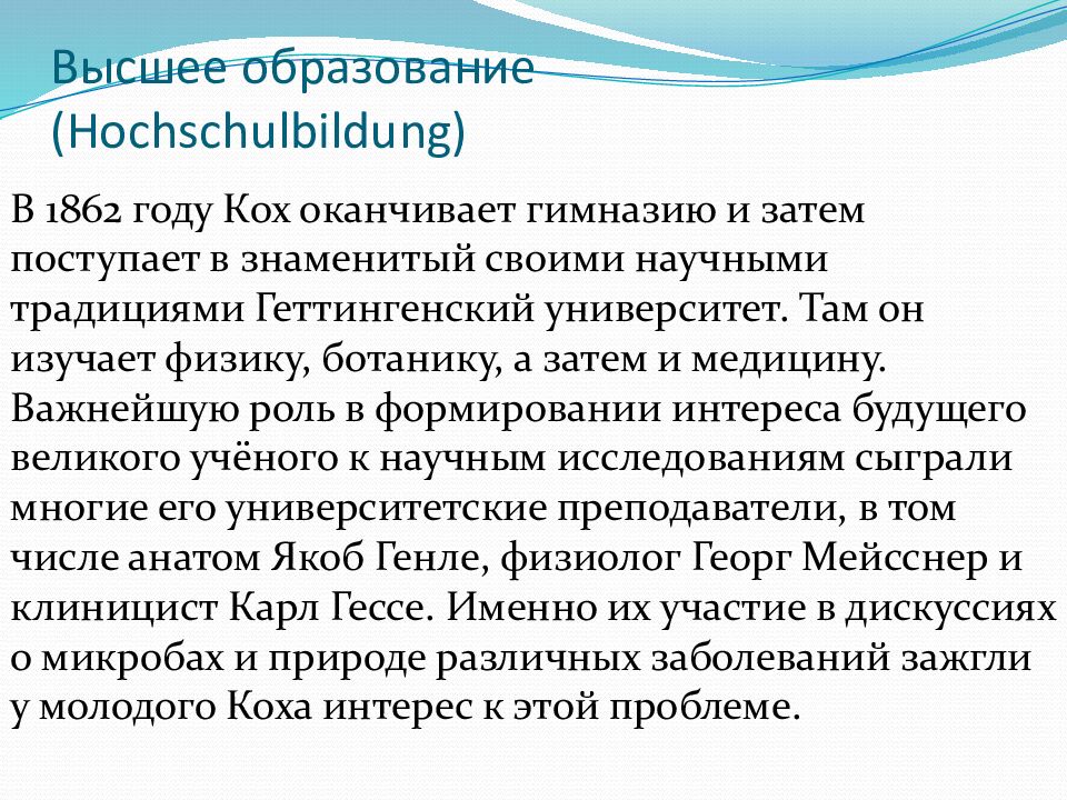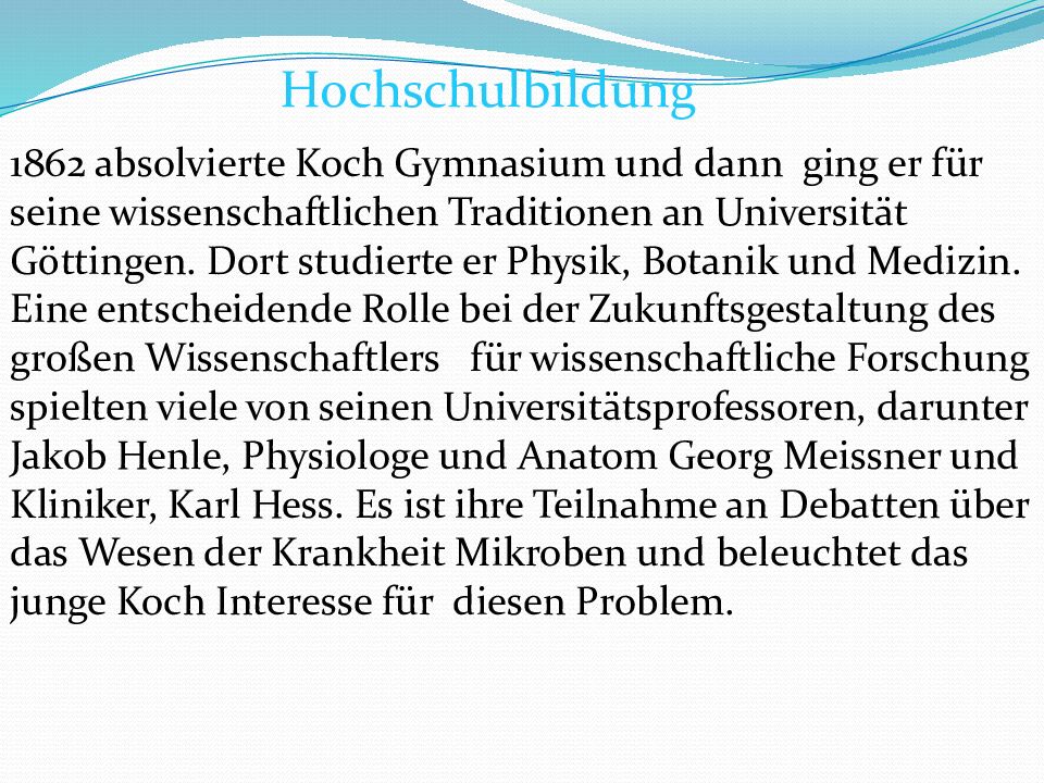 Hochschulbildung 1862 absolvierte Koch Gymnasium und dann ging er für seine wissenschaftlichen Traditionen an Universität Göttingen. Dort studierte er Physik, Botanik und Medizin. Eine entscheidende Rolle bei der Zukunftsgestaltung des großen Wissenschaftlers für wissenschaftliche Forschung spielten viele von seinen Universitätsprofessoren, darunter Jakob Henle, Physiologe und Anatom Georg Meissner und Kliniker, Karl Hess. Es ist ihre Teilnahme an Debatten über das Wesen der Krankheit Mikroben und beleuchtet das junge Koch Interesse für diesen Problem.