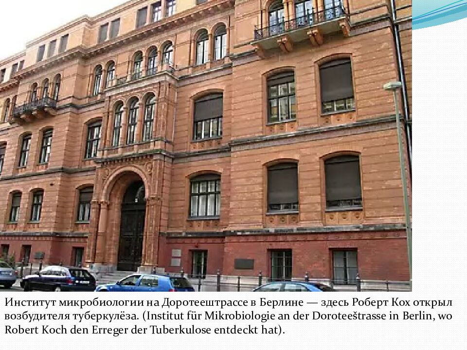 Институт микробиологии на Доротеештрассе в Берлине — здесь Роберт Кох открыл возбудителя туберкулёза. ( Institut für Mikrobiologie an der Doroteeštrasse in Berlin, wo Robert Koch den Erreger der Tuberkulose entdeckt hat).