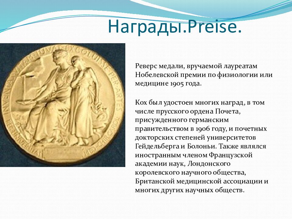 Реверс медали, вручаемой лауреатам Нобелевской премии по физиологии или медицине 1905 года. Кох был удостоен многих наград, в том числе прусского ордена Почета, присужденного германским правительством в 1906 году, и почетных докторских степеней университетов Гейдельберга и Болоньи. Также являлся иностранным членом Французской академии наук, Лондонского королевского научного общества, Британской медицинской ассоциации и многих других научных обществ.