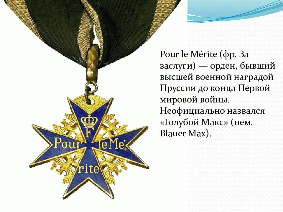 Pour le Mérite (фр. За заслуги) — орден, бывший высшей военной наградой Пруссии до конца Первой мировой войны. Неофициально назвался « Голубой Макс» (нем. Blauer Max ).