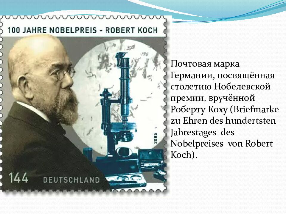 Почтовая марка Германии, посвящённая столетию Нобелевской премии, вручённой Роберту Коху ( B riefmarke zu Ehren des hundertsten Jahrestages des Nobelpreises von Robert Koch ).