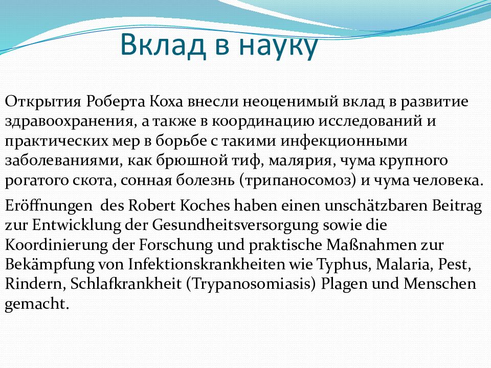 Открытия Роберта Коха внесли неоценимый вклад в развитие здравоохранения, а также в координацию исследований и практических мер в борьбе с такими инфекционными заболеваниями, как брюшной тиф, малярия, чума крупного рогатого скота, сонная болезнь (трипаносомоз) и чума человека. Вклад в науку Eröffnungen des Robert Koches haben einen unschätzbaren Beitrag zur Entwicklung der Gesundheitsversorgung sowie die Koordinierung der Forschung und praktische Maßnahmen zur Bekämpfung von Infektionskrankheiten wie Typhus, Malaria, Pest, Rindern, Schlafkrankheit ( Trypanosomiasis ) Plagen und Menschen gemacht.