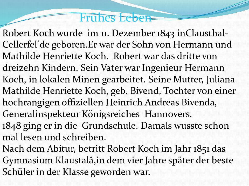 Robert Koch wurde im 11. Dezember 1843 in Clausthal- Cellerfel′de geboren.Er war der Sohn von Hermann und Mathilde Henriette Koch. Robert war das dritte von dreizehn Kindern. Sein Vater war Ingenieur Hermann Koch, in lokalen Minen gearbeitet. Seine Mutter, Juliana Mathilde Henriette Koch, geb. Bivend, Tochter von einer hochrangigen offiziellen Heinrich Andreas Bivenda, Generalinspekteur Königsreiches Hannovers. 1848 ging er in die Grundschule. Damals wusste schon mal lesen und schreiben. Nach dem Abitur, betritt Robert Koch im Jahr 1851 das Gymnasium Klaustalâ, i n dem vier Jahre später der beste Schüler in der Klasse geworden war. Frühes Leben