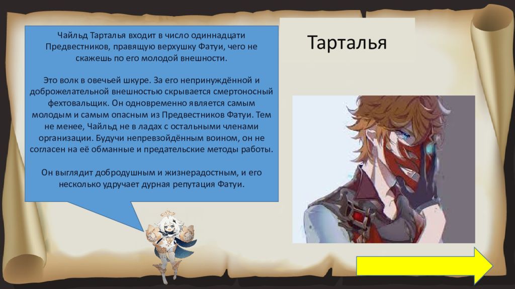 Тарталья Чайльд Тарталья входит в число одиннадцати Предвестников, правящую верхушку Фатуи, чего не скажешь по его молодой внешности. Это волк в овечьей шкуре. За его непринуждённой и доброжелательной внешностью скрывается смертоносный фехтовальщик. Он одновременно является самым молодым и самым опасным из Предвестников Фатуи. Тем не менее, Чайльд не в ладах с остальными членами организации. Будучи непревзойдённым воином, он не согласен на её обманные и предательские методы работы. Он выглядит добродушным и жизнерадостным, и его несколько удручает дурная репутация Фатуи.