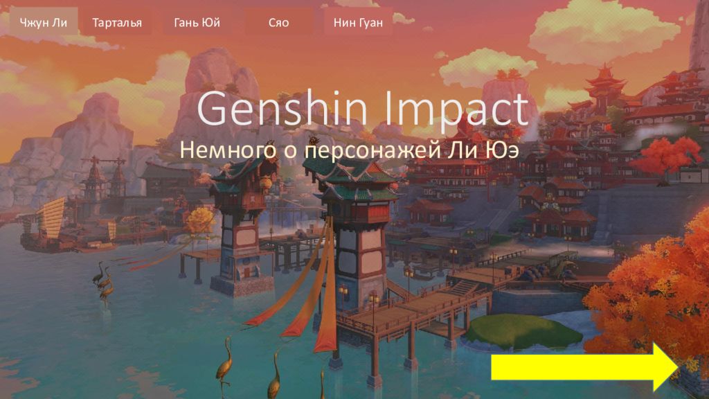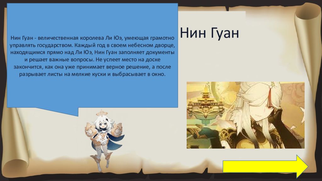 Нин Гуан Нин Гуан - величественная королева Ли Юэ, умеющая грамотно управлять государством. Каждый год в своем небесном дворце, находящимся прямо над Ли Юэ, Нин Гуан заполняет документы и решает важные вопросы. Не успеет место на доске закончится, как она уже принимает верное решение, а после разрывает листы на мелкие куски и выбрасывает в окно.