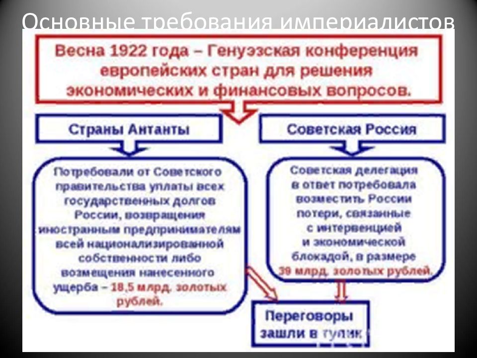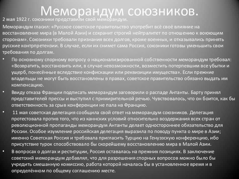 2 мая 1922 г. союзники представили свой меморандум. Меморандум гласил: «Русское советское правительство употребит всё своё влияние на восстановление мира (в Малой Азии) и сохранит строгий нейтралитет по отношению к воюющим сторонам». Союзники требовали признания всех долгов, кроме военных, и отказывались принять русские контрпретензии. В случае, если их снимет сама Россия, союзники готовы уменьшить свои требования по долгам. По основному спорному вопросу о национализированной собственности меморандум требовал: «Возвратить, восстановить или, в случае невозможности, возместить потерпевшим все убытки и ущерб, понесённые вследствие конфискации или реквизиции имущества». Если прежние владельцы не могут быть восстановлены в правах, советское правительство обязано выдать им компенсацию. Ввиду отказа Франции подписать меморандум заговорили о распаде Антанты. Барту принял представителей прессы и выступил с примирительной речью. Чувствовалось, что он боится, как бы ответственность за срыв конференции не пала на Францию. 11 мая советская делегация сообщила свой ответ на меморандум союзников. Делегация протестовала против того, что из каннских условий относительно воздержания всех стран от революционной пропаганды меморандум Антанты делает одностороннее обязательство для России. Особое изумление российская делегация выразила по поводу пункта о мире в Азии; именно Советская Россия и требовала пригласить Турцию на Генуэзскую конференцию, ибо присутствие турок способствовало бы скорейшему восстановлению мира в Малой Азии. В вопросах о долгах и реституции, Россия оставалась на прежних позициях. В заключение советский меморандум добавлял, что для разрешения спорных вопросов можно было бы учредить смешанную комиссию, работа которой началась бы в установленное время и в определённом по общему соглашению месте.