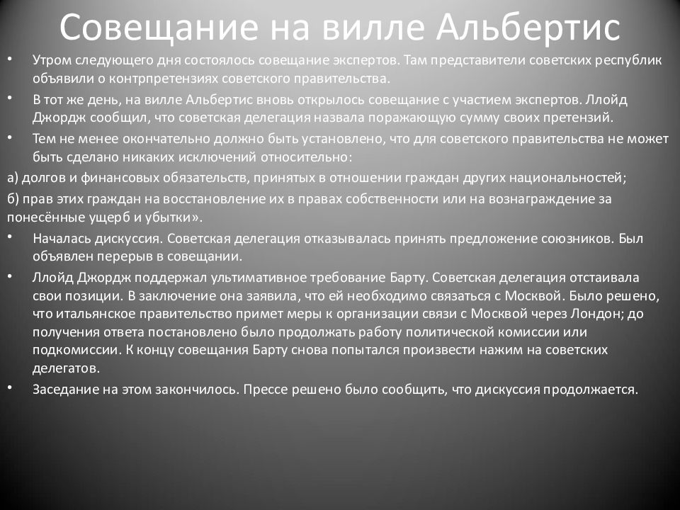 Утром следующего дня состоялось совещание экспертов. Там представители советских республик объявили о контрпретензиях советского правительства. В тот же день, на вилле Альбертис вновь открылось совещание с участием экспертов. Ллойд Джордж сообщил, что советская делегация назвала поражающую сумму своих претензий. Тем не менее окончательно должно быть установлено, что для советского правительства не может быть сделано никаких исключений относительно: а) долгов и финансовых обязательств, принятых в отношении граждан других национальностей; б) прав этих граждан на восстановление их в правах собственности или на вознаграждение за понесённые ущерб и убытки». Началась дискуссия. Советская делегация отказывалась принять предложение союзников. Был объявлен перерыв в совещании. Ллойд Джордж поддержал ультимативное требование Барту. Советская делегация отстаивала свои позиции. В заключение она заявила, что ей необходимо связаться с Москвой. Было решено, что итальянское правительство примет меры к организации связи с Москвой через Лондон; до получения ответа постановлено было продолжать работу политической комиссии или подкомиссии. К концу совещания Барту снова попытался произвести нажим на советских делегатов. Заседание на этом закончилось. Прессе решено было сообщить, что дискуссия продолжается.