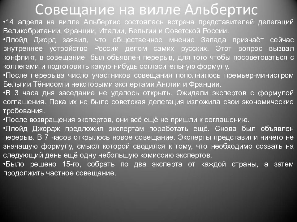 14 апреля на вилле Альбертис состоялась встреча представителей делегаций Великобритании, Франции, Италии, Бельгии и Советской России. Ллойд Джорд заявил, что общественное мнение Запада признаёт сейчас внутреннее устройство России делом самих русских. Этот вопрос вызвал конфликт, в совещание был объявлен перерыв, для того чтобы посоветоваться с коллегами и подготовить какую-нибудь согласительную формулу. После перерыва число участников совещания пополнилось премьер-министром Бельгии Тёнисом и некоторыми экспертами Англии и Франции. В 3 часа дня заседание не удалось открыть. Ожидали экспертов с формулой соглашения. Пока их не было советская делегация изложила свои экономические требования. После возвращения экспертов, они всё ещё не пришли к соглашению. Ллойд Джордж предложил экспертам поработать ещё. Снова был объявлен перерыв. В 7 часов открылось новое совещание. Эксперты представили ничего не значащую формулу, смысл которой сводился к тому, что необходимо созвать на следующий день ещё одну небольшую комиссию экспертов. Было решено 15-го, собрать по два эксперта от каждой страны, а затем продолжить частное совещание.