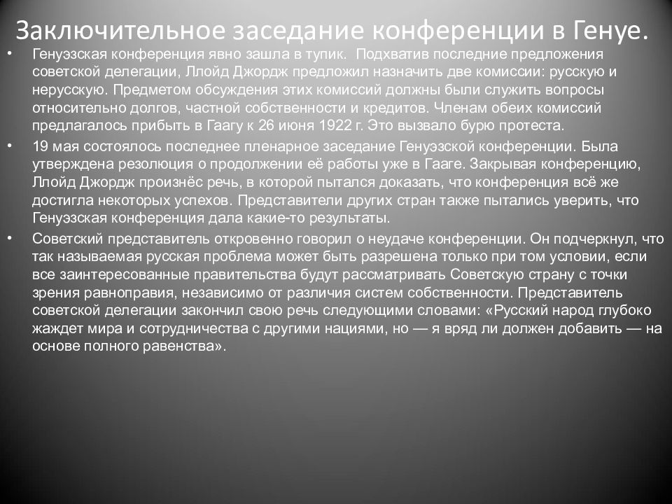 Генуэзская конференция явно зашла в тупик. Подхватив последние предложения советской делегации, Ллойд Джордж предложил назначить две комиссии: русскую и нерусскую. Предметом обсуждения этих комиссий должны были служить вопросы относительно долгов, частной собственности и кредитов. Членам обеих комиссий предлагалось прибыть в Гаагу к 26 июня 1922 г. Это вызвало бурю протеста. 19 мая состоялось последнее пленарное заседание Генуэзской конференции. Была утверждена резолюция о продолжении её работы уже в Гааге. Закрывая конференцию, Ллойд Джордж произнёс речь, в которой пытался доказать, что конференция всё же достигла некоторых успехов. Представители других стран также пытались уверить, что Генуэзская конференция дала какие-то результаты. Советский представитель откровенно говорил о неудаче конференции. Он подчеркнул, что так называемая русская проблема может быть разрешена только при том условии, если все заинтересованные правительства будут рассматривать Советскую страну с точки зрения равноправия, независимо от различия систем собственности. Представитель советской делегации закончил свою речь следующими словами: «Русский народ глубоко жаждет мира и сотрудничества с другими нациями, но — я вряд ли должен добавить — на основе полного равенства».