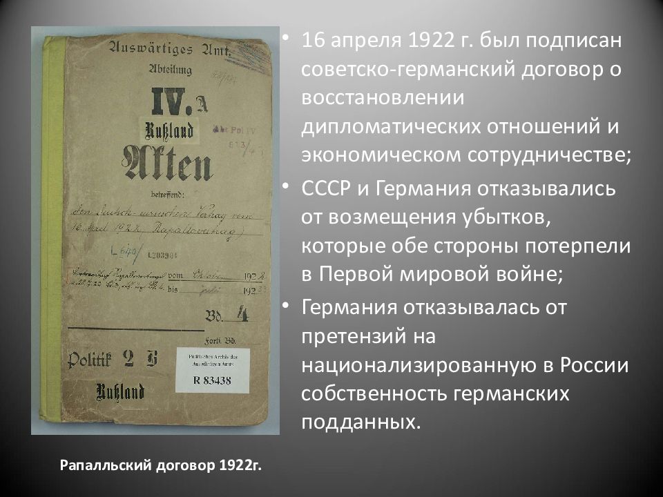 16 апреля 1922 г. был подписан советско-германский договор о восстановлении дипломатических отношений и экономическом сотрудничестве; СССР и Германия отказывались от возмещения убытков, которые обе стороны потерпели в Первой мировой войне; Германия отказывалась от претензий на национализированную в России собственность германских подданных. Доктор Вальтер Ратенау, подписавший договор с Россией в Рапалло. Рапалльский договор 1922г.
