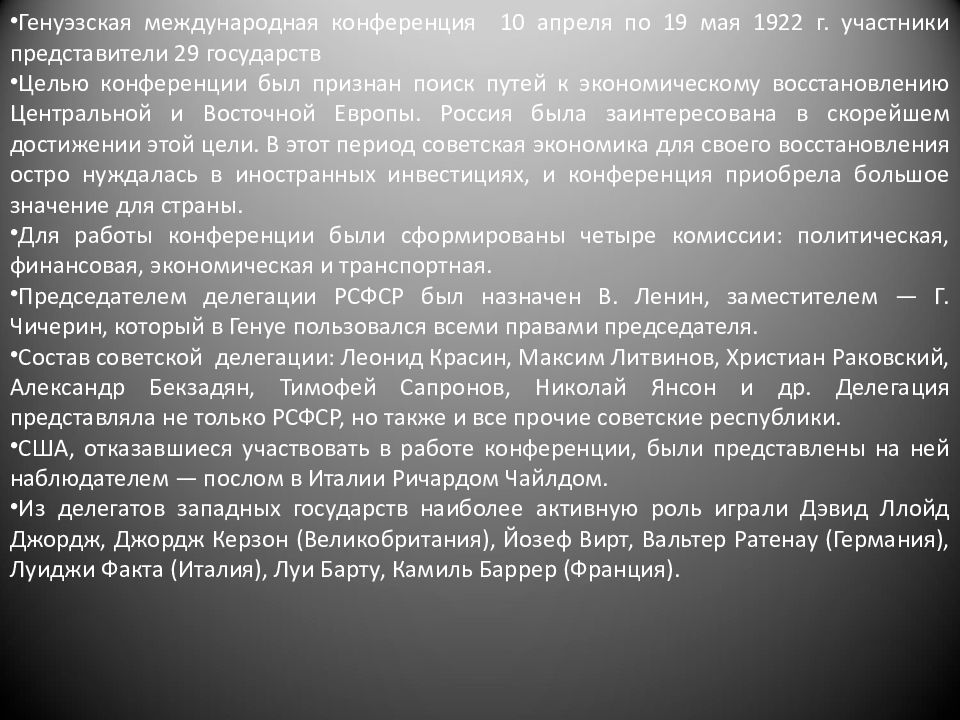 Генуэзская международная конференция 10 апреля по 19 мая 1922 г. участники представители 29 государств Целью конференции был признан поиск путей к экономическому восстановлению Центральной и Восточной Европы. Россия была заинтересована в скорейшем достижении этой цели. В этот период советская экономика для своего восстановления остро нуждалась в иностранных инвестициях, и конференция приобрела большое значение для страны. Для работы конференции были сформированы четыре комиссии: политическая, финансовая, экономическая и транспортная. Председателем делегации РСФСР был назначен В. Ленин, заместителем — Г. Чичерин, который в Генуе пользовался всеми правами председателя. Состав советской делегации: Леонид Красин, Максим Литвинов, Христиан Раковский, Александр Бекзадян, Тимофей Сапронов, Николай Янсон и др. Делегация представляла не только РСФСР, но также и все прочие советские республики. США, отказавшиеся участвовать в работе конференции, были представлены на ней наблюдателем — послом в Италии Ричардом Чайлдом. Из делегатов западных государств наиболее активную роль играли Дэвид Ллойд Джордж, Джордж Керзон (Великобритания), Йозеф Вирт, Вальтер Ратенау (Германия), Луиджи Факта (Италия), Луи Барту, Камиль Баррер (Франция).