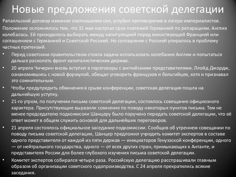 Рапалльский договор изменил соотношение сил, углубил противоречия в лагере империалистов. Положение осложнялось тем, что 31 мая наступал срок платежей Германией по репарациям. Англия колебалась. Ей приходилось выбирать между капитуляцией перед воинствующей Францией или соглашением с Германией и Советской Россией. Но соглашение с Россией упиралось в проблему частных претензий. Перед советским правительством стояла задача использовать колебания Англии и попытаться дальше расколоть фронт капиталистических держав. 20 апреля Чичерин вновь вступил в переговоры с английскими представителями. Ллойд Джордж, ознакомившись с новой формулой, обещал уговорить французов и бельгийцев, хотя и признавал это сомнительным. Чтобы предупредить обвинения в срыве конференции, советская делегация пошла на дальнейшую уступку. 21-го утром, по получении письма советской делегации, состоялось совещание официозного характера. Присутствующие выразили сомнение по поводу некоторых пунктов письма. Тем не менее председателю подкомиссии Шанцеру было поручено передать советской делегации, что её ответ может в общем служить основой для дальнейших переговоров. 21 апреля состоялось официальное заседание подкомиссии. Сообщив об утреннем совещании по поводу письма советской делегации, Шанцер предложил учредить комитет экспертов в составе одного представителя от каждой из пяти держав — инициаторов Генуэзской конференции, одного — от нейтрального государства, одного — от всех других стран, примыкающих к Антанте, и представителя России для более глубокого изучения письма советской делегации. Комитет экспертов собирался четыре раза. Российскую делегацию расспрашивали главным образом об организации советского судопроизводства. С 24 апреля прекратились всякие заседания.