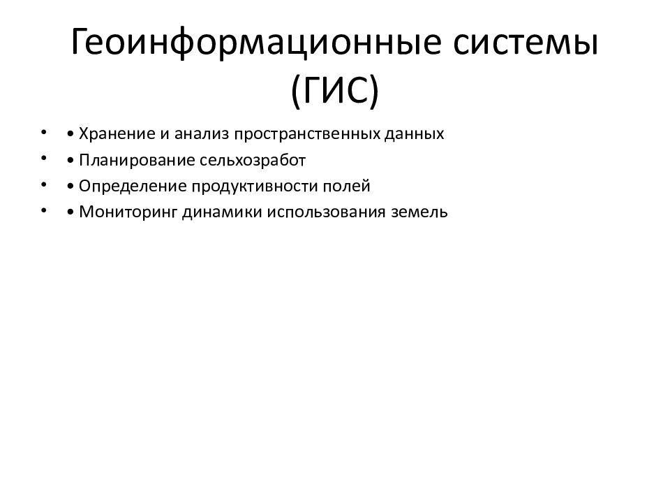 • Хранение и анализ пространственных данных • Планирование сельхозработ • Определение продуктивности полей • Мониторинг динамики использования земель
