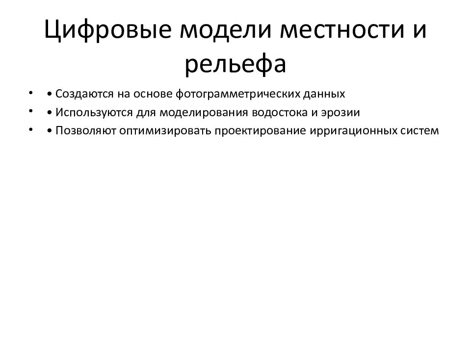 • Создаются на основе фотограмметрических данных • Используются для моделирования водостока и эрозии • Позволяют оптимизировать проектирование ирригационных систем
