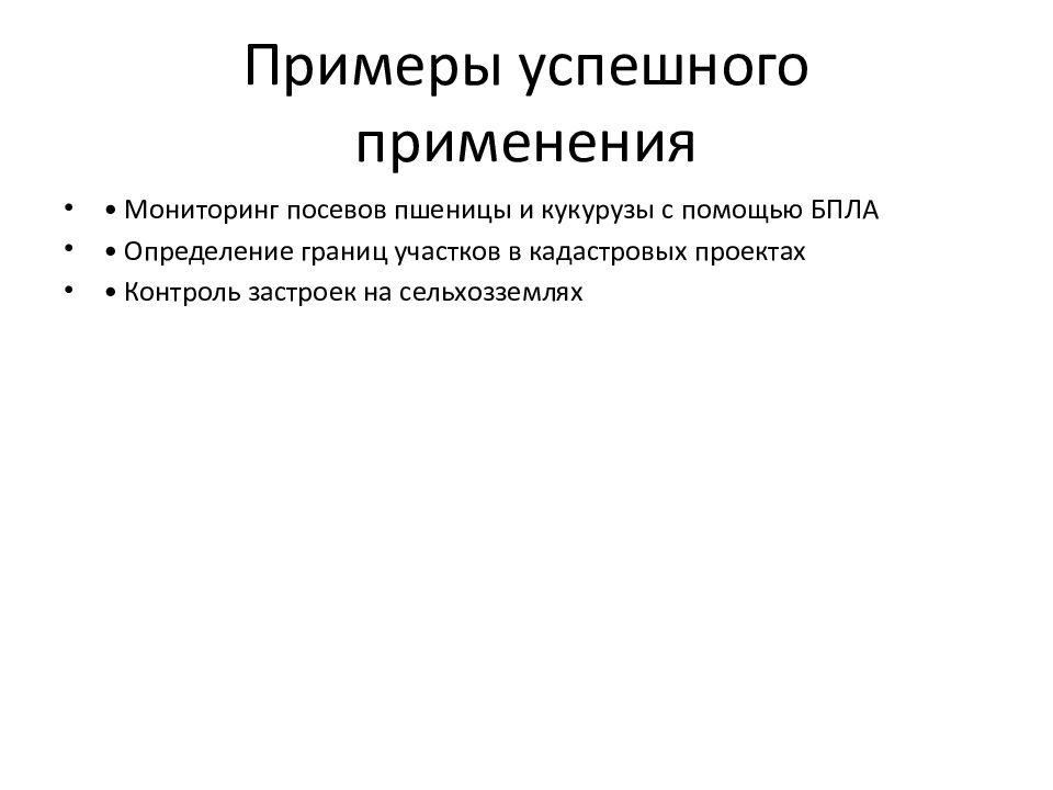 • Мониторинг посевов пшеницы и кукурузы с помощью БПЛА • Определение границ участков в кадастровых проектах • Контроль застроек на сельхозземлях