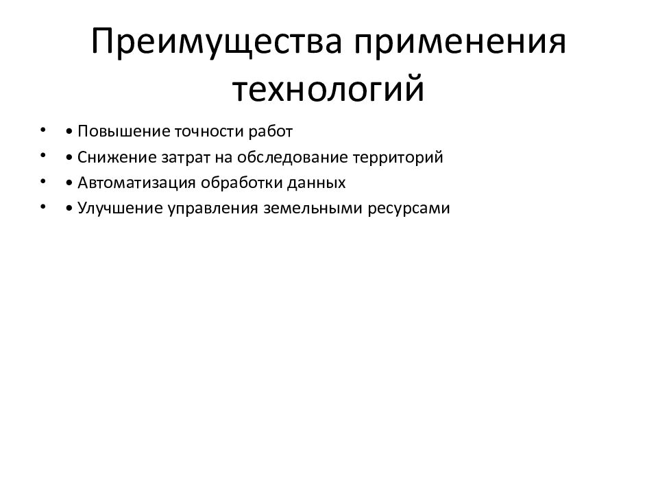 • Повышение точности работ • Снижение затрат на обследование территорий • Автоматизация обработки данных • Улучшение управления земельными ресурсами