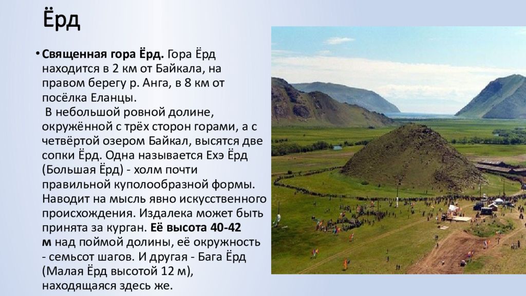 Священная гора Ёрд. Гора Ёрд находится в 2 км от Байкала, на правом берегу р. Анга, в 8 км от посёлка Еланцы. В небольшой ровной долине, окружённой с трёх сторон горами, а с четвёртой озером Байкал, высятся две сопки Ёрд. Одна называется Ехэ Ёрд (Большая Ёрд ) - холм почти правильной куполообразной формы. Наводит на мысль явно искусственного происхождения. Издалека может быть принята за курган. Её высота 40-42 м над поймой долины, её окружность - семьсот шагов. И другая - Бага Ёрд (Малая Ёрд высотой 12 м), находящаяся здесь же.