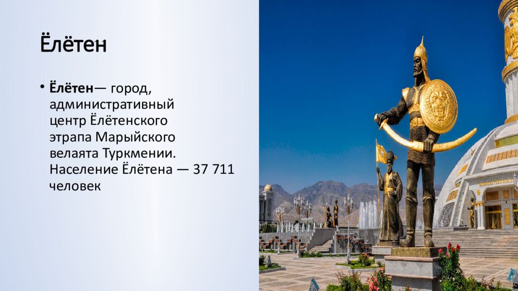 Ёлётен — город, административный центр Ёлётенского этрапа Марыйского велаята Туркмении. Население Ёлётена — 37 711 человек