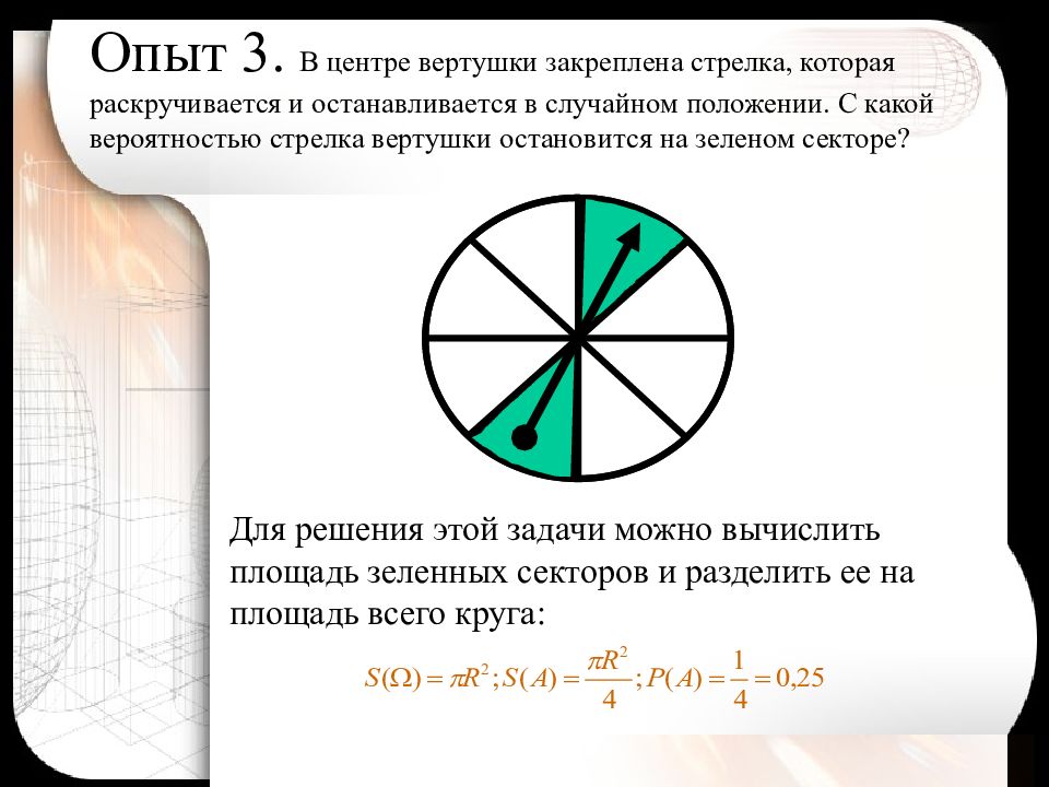 Слайд 8: Опыт 3. В центре вертушки закреплена стрелка, которая раскручивается и останавливается в случайном положении. С какой вероятностью стрелка вертушки остановится на зеленом секторе?