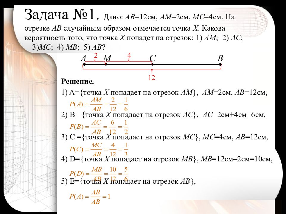 Слайд 10: Задача №1. Дано: АВ =12см, АМ =2см, МС =4см. На отрезке АВ случайным образом отмечается точка Х. Какова вероятность того, что точка Х попадет на отрезок: 1) АМ ; 2) АС ; 3) МС ; 4) МВ ; 5) АВ ?