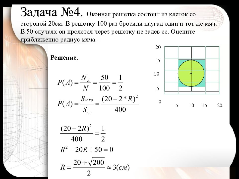 Слайд 13: Задача №4. Оконная решетка состоит из клеток со стороной 20см. В решетку 100 раз бросили наугад один и тот же мяч. В 50 случаях он пролетел через решетку не задев ее. Оцените приближенно радиус мяча