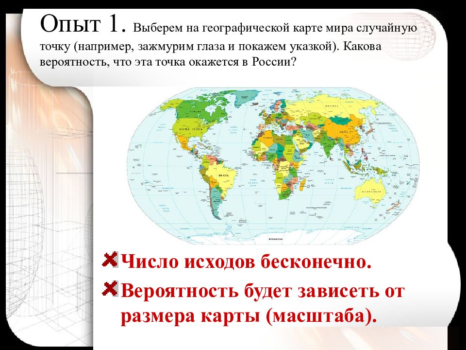 Число исходов бесконечно. Вероятность будет зависеть от размера карты (масштаба).