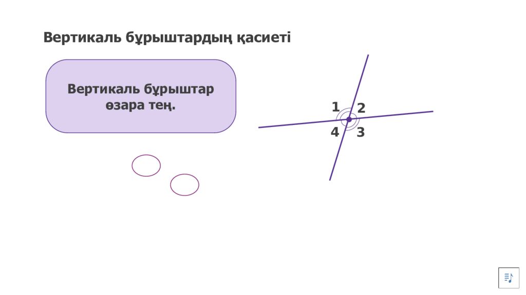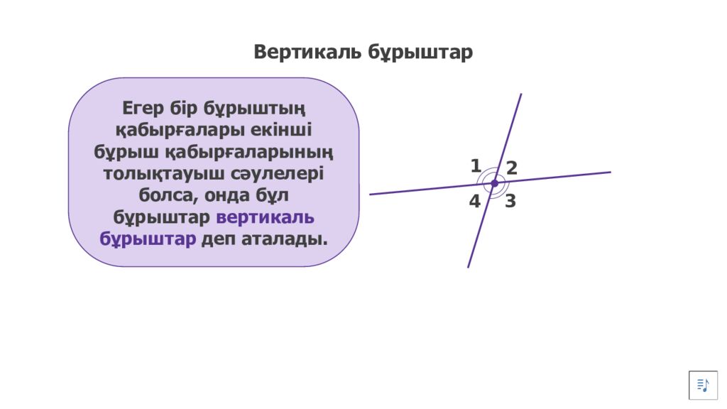 Вертикаль бұрыштар Егер бір бұрыштың қабырғалары екінші бұрыш қабырғаларының толықтауыш сәулелері болса, онда бұл бұрыштар вертикаль бұрыштар деп аталады. 2 1 3 4