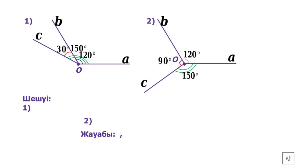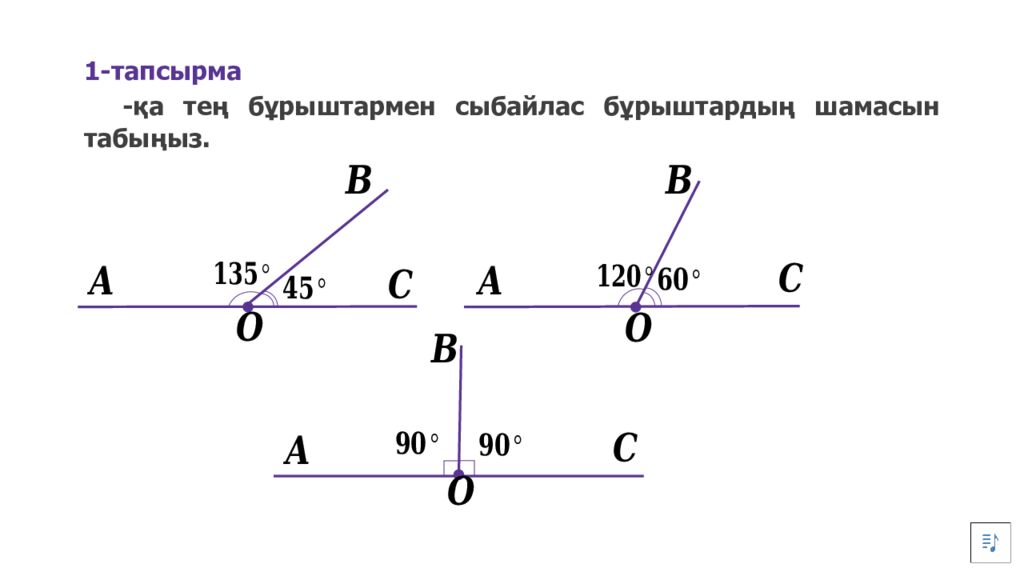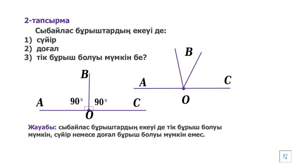 2-тапсырма Сыбайлас бұрыштардың екеуі де: сүйір доғал тік бұрыш болуы мүмкін бе? Жауабы: сыбайлас бұрыштардың екеуі де тік бұрыш болуы мүмкін, сүйір немесе доғал бұрыш болуы мүмкін емес.