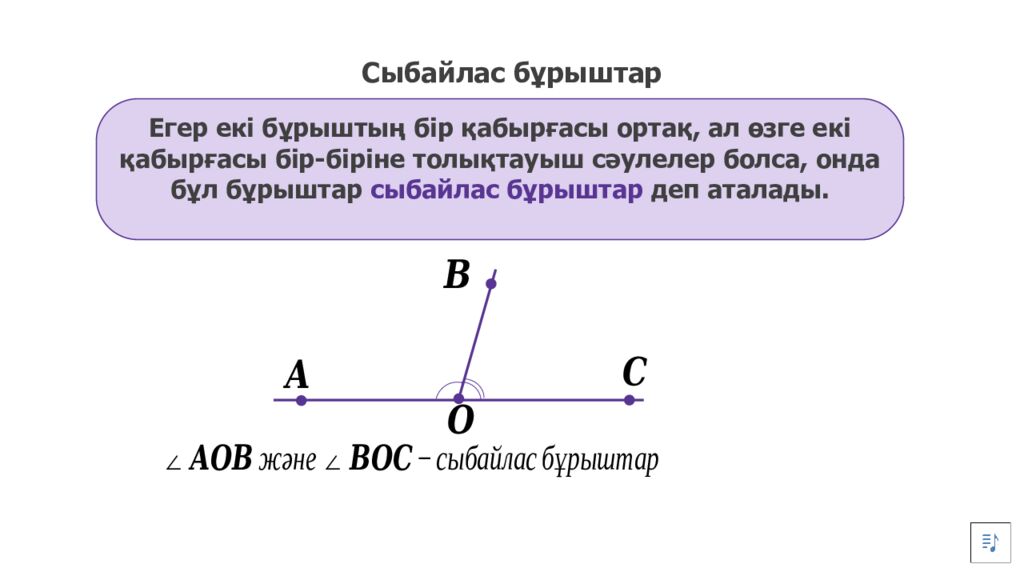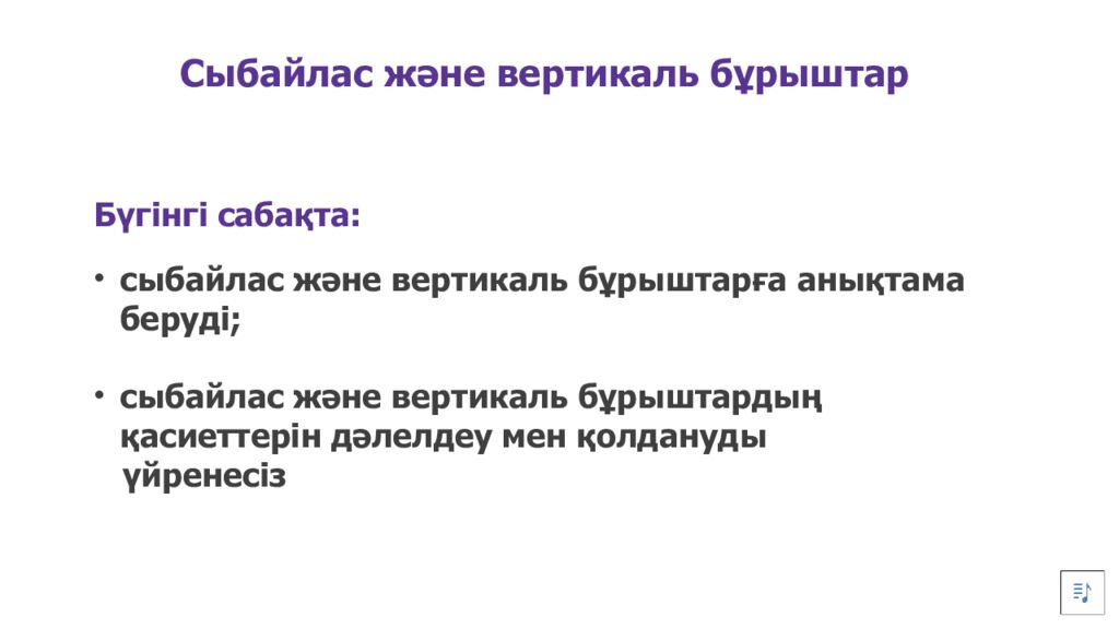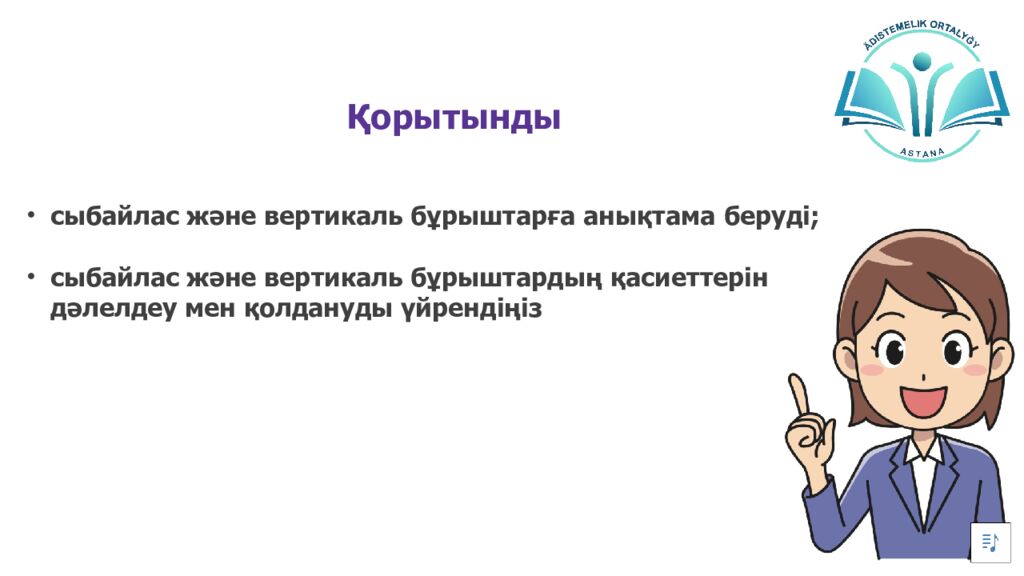 Бүгінгі сабақта: сыбайлас және вертикаль бұрыштарға анықтама беруді; сыбайлас және вертикаль бұрыштардың қасиеттерін дәлелдеу мен қолдануды үйренесіз Сыбайлас және вертикаль бұрыштар