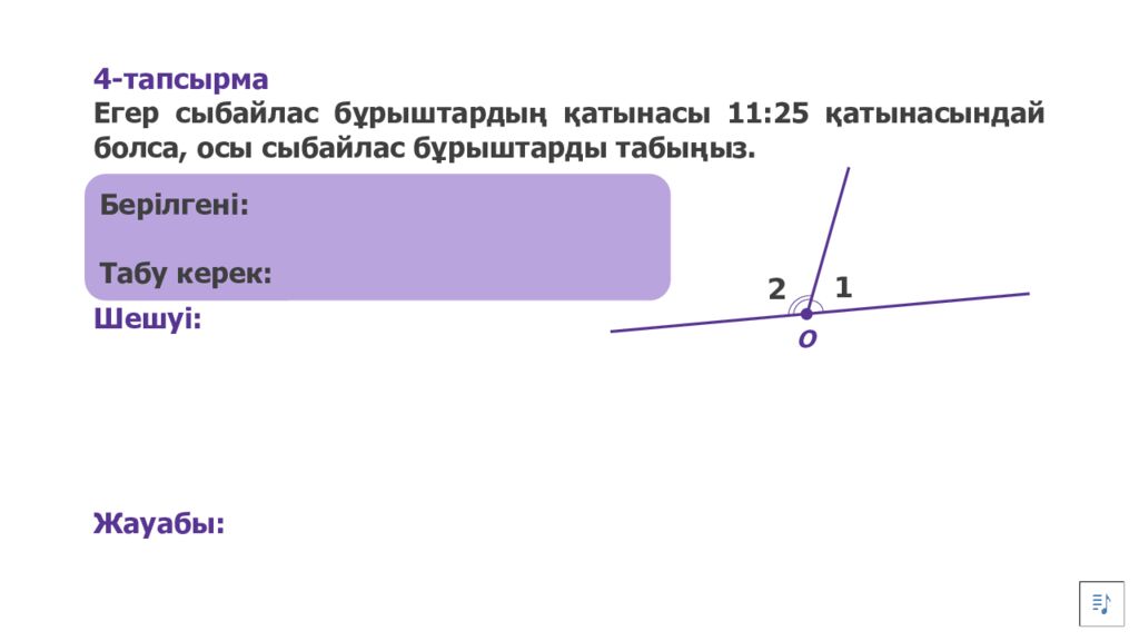 4-тапсырма Егер сыбайлас бұрыштардың қатынасы 11:25 қатынасындай болса, осы сыбайлас бұрыштарды табыңыз. Шешуі: Жауабы: 1 2 О Берілгені: Табу керек: