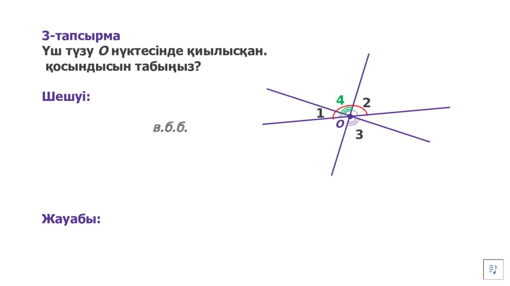 3-тапсырма Үш түзу О нүктесінде қиылысқан. қосындысын табыңыз? Шешуі: в.б.б. Жауабы: 2 1 3 4 О