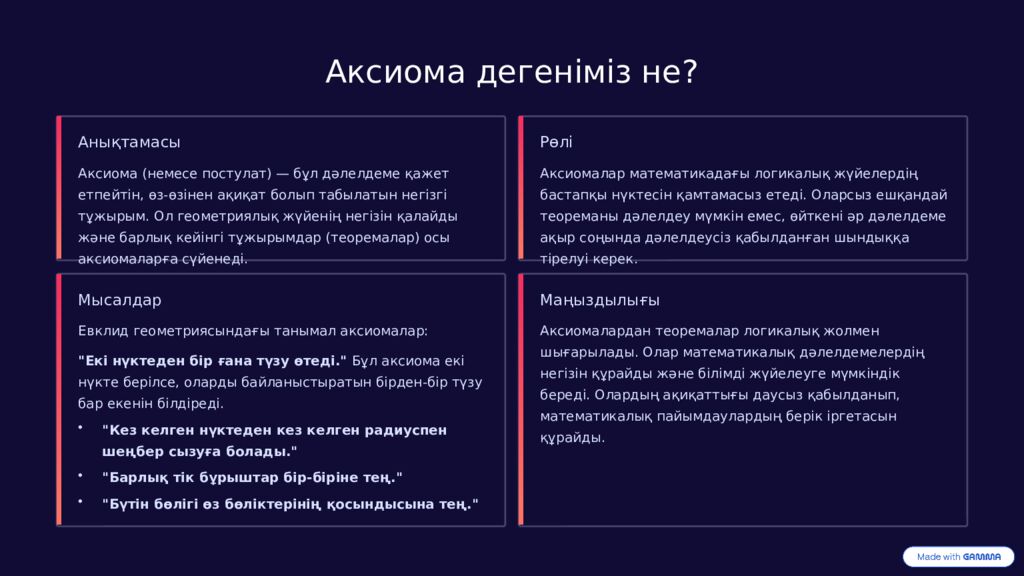 Аксиома дегеніміз не? Анықтамасы Аксиома (немесе постулат) — бұл дәлелдеме қажет етпейтін, өз-өзінен ақиқат болып табылатын негізгі тұжырым. Ол геометриялық жүйенің негізін қалайды және барлық кейінгі тұжырымдар (теоремалар) осы аксиомаларға сүйенеді. Рөлі Аксиомалар математикадағы логикалық жүйелердің бастапқы нүктесін қамтамасыз етеді. Оларсыз ешқандай теореманы дәлелдеу мүмкін емес, өйткені әр дәлелдеме ақыр соңында дәлелдеусіз қабылданған шындыққа тірелуі керек. Мысалдар Евклид геометриясындағы танымал аксиомалар: "Екі нүктеден бір ғана түзу өтеді." Бұл аксиома екі нүкте берілсе, оларды байланыстыратын бірден-бір түзу бар екенін білдіреді. "Кез келген нүктеден кез келген радиуспен шеңбер сызуға болады." "Барлық тік бұрыштар бір-біріне тең." "Бүтін бөлігі өз бөліктерінің қосындысына тең." Маңыздылығы Аксиомалардан теоремалар логикалық жолмен шығарылады. Олар математикалық дәлелдемелердің негізін құрайды және білімді жүйелеуге мүмкіндік береді. Олардың ақиқаттығы даусыз қабылданып, математикалық пайымдаулардың берік іргетасын құрайды.