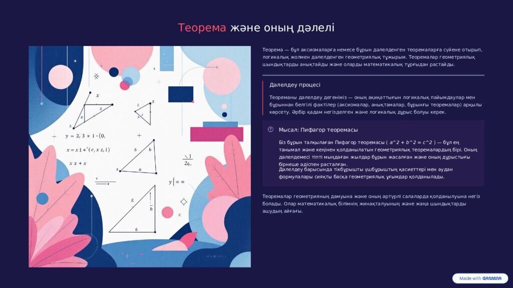 Теорема және оның дәлелі Теорема — бұл аксиомаларға немесе бұрын дәлелденген теоремаларға сүйене отырып, логикалық жолмен дәлелденген геометриялық тұжырым. Теоремалар геометриялық шындықтарды анықтайды және оларды математикалық тұрғыдан растайды. Дәлелдеу процесі Теореманы дәлелдеу дегеніміз — оның ақиқаттығын логикалық пайымдаулар мен бұрыннан белгілі фактілер (аксиомалар, анықтамалар, бұрынғы теоремалар) арқылы көрсету. Әрбір қадам негізделген және логикалық дұрыс болуы керек. Мысал: Пифагор теоремасы Біз бұрын талқылаған Пифагор теоремасы ( a^2 + b^2 = c^2 ) — бұл ең танымал және кеңінен қолданылатын геометриялық теоремалардың бірі. Оның дәлелдемесі тіпті мыңдаған жылдар бұрын жасалған және оның дұрыстығы бірнеше әдіспен расталған. Дәлелдеу барысында тікбұрышты үшбұрыштың қасиеттері мен аудан формулалары сияқты басқа геометриялық ұғымдар қолданылады. Теоремалар геометрияның дамуына және оның әртүрлі салаларда қолданылуына негіз болады. Олар математикалық білімнің жинақталуының және жаңа шындықтарды ашудың айғағы.