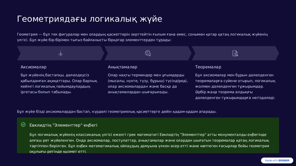 Геометриядағы логикалық жүйе Геометрия — бұл тек фигуралар мен олардың қасиеттерін зерттейтін ғылым ғана емес, сонымен қатар қатаң логикалық жүйенің үлгісі. Бұл жүйе бір-бірімен тығыз байланысты бірқатар элементтерден тұрады: Аксиомалар Бұл жүйенің бастапқы, дәлелдеусіз қабылданған ақиқаттары. Олар барлық кейінгі логикалық пайымдаулардың іргетасы болып табылады. Анықтамалар Олар нақты терминдер мен ұғымдарды (мысалы, нүкте, түзу, бұрыш) түсіндіреді, олар аксиомалардан және басқа да анықтамалардан шығарылады. Теоремалар Бұл аксиомалар мен бұрын дәлелденген теоремаларға сүйене отырып, логикалық жолмен дәлелденген тұжырымдар. Әрбір жаңа теорема алдыңғы дәлелденген тұжырымдарға негізделеді. Бұл жүйе бізді аксиомалардан бастап, күрделі геометриялық қасиеттерге дейін қадам-қадам апарады. Евклидтің "Элементтер" еңбегі Бұл логикалық жүйенің классикалық үлгісі ежелгі грек математигі Евклидтің "Элементтер" атты монументалды еңбегінде алғаш рет жүйеленген. Онда аксиомалар, постулаттар, анықтамалар және олардан шығатын теоремалар қатаң логикалық тәртіппен берілген. Бұл еңбек математикалық ойлаудың дамуына үлкен әсер етті және көптеген ғасырлар бойы геометрия оқулығы ретінде қызмет етті.