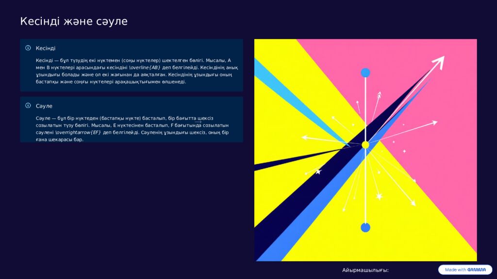 Кесінді және сәуле Кесінді Кесінді — бұл түзудің екі нүктемен (соңы нүктелер) шектелген бөлігі. Мысалы, А мен В нүктелері арасындағы кесіндіні \overline{AB} деп белгілейді. Кесіндінің анық ұзындығы болады және ол екі жағынан да аяқталған. Кесіндінің ұзындығы оның бастапқы және соңғы нүктелері арақашықтығымен өлшенеді. Сәуле Сәуле — бұл бір нүктеден (бастапқы нүкте) басталып, бір бағытта шексіз созылатын түзу бөлігі. Мысалы, Е нүктесінен басталып, F бағытында созылатын сәулені \overrightarrow{EF} деп белгілейді. Сәуленің ұзындығы шексіз, оның бір ғана шекарасы бар. Айырмашылығы: Кесіндіде екі шекара бар, ал сәуледе бір ғана бастапқы шекара бар және ол бір бағытта шексіз жалғасады. Бұл ұғымдар геометриялық фигураларды құруда және бұрыштарды, көпбұрыштарды анықтауда маңызды рөл атқарады.