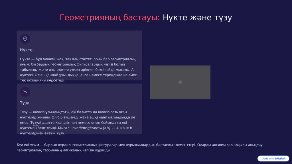 Геометрияның бастауы: Нүкте және түзу Нүкте Нүкте — бұл өлшемі жоқ, тек кеңістіктегі орны бар геометриялық ұғым. Ол барлық геометриялық фигуралардың негізі болып табылады және оны әдетте үлкен әріппен белгілейді, мысалы, A нүктесі. Ол ешқандай ұзындыққа, енге немесе тереңдікке ие емес, тек позицияны көрсетеді. Түзу Түзу — шексіз ұзындықтағы, екі бағытта да шексіз созылған нүктелер жиыны. Ол бір өлшемді және ешқандай қалыңдыққа ие емес. Түзуді әдетте кіші әріппен немесе оның бойындағы екі нүктемен белгілейді. Мысал: \overleftrightarrow{AB} — А және В нүктелерінен өтетін түзу. Бұл екі ұғым — барлық күрделі геометриялық фигуралар мен құрылымдардың бастапқы элементтері. Оларды аксиомалар арқылы анықтау геометриялық теорияның логикалық негізін құрайды.