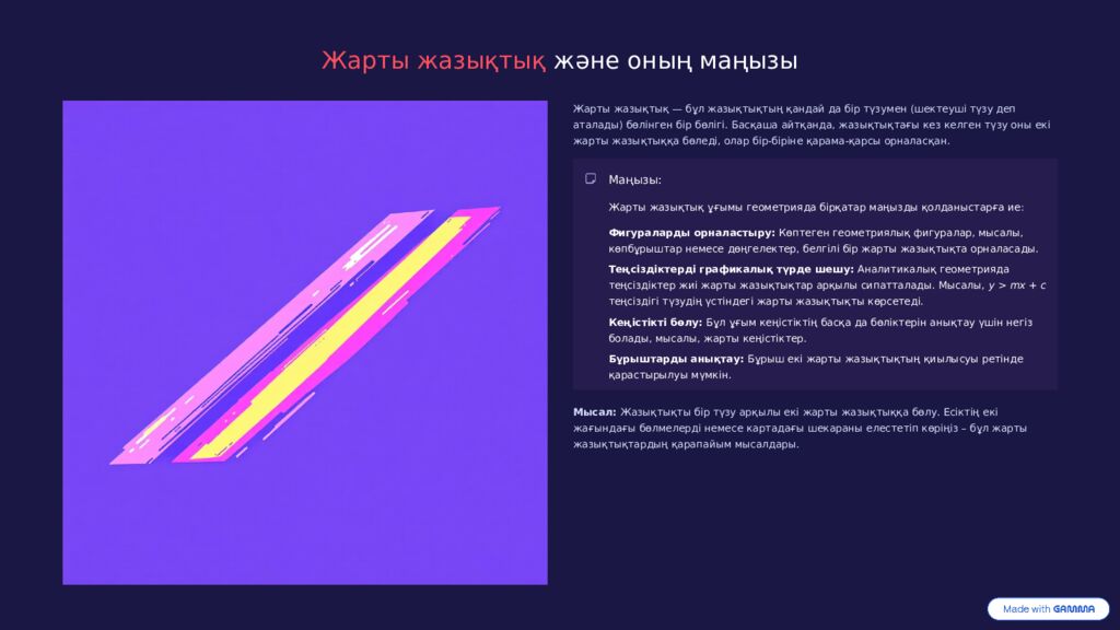 Жарты жазықтық және оның маңызы Жарты жазықтық — бұл жазықтықтың қандай да бір түзумен (шектеуші түзу деп аталады) бөлінген бір бөлігі. Басқаша айтқанда, жазықтықтағы кез келген түзу оны екі жарты жазықтыққа бөледі, олар бір-біріне қарама-қарсы орналасқан. Маңызы: Жарты жазықтық ұғымы геометрияда бірқатар маңызды қолданыстарға ие: Фигураларды орналастыру: Көптеген геометриялық фигуралар, мысалы, көпбұрыштар немесе дөңгелектер, белгілі бір жарты жазықтықта орналасады. Теңсіздіктерді графикалық түрде шешу: Аналитикалық геометрияда теңсіздіктер жиі жарты жазықтықтар арқылы сипатталады. Мысалы, y > mx + c теңсіздігі түзудің үстіндегі жарты жазықтықты көрсетеді. Кеңістікті бөлу: Бұл ұғым кеңістіктің басқа да бөліктерін анықтау үшін негіз болады, мысалы, жарты кеңістіктер. Бұрыштарды анықтау: Бұрыш екі жарты жазықтықтың қиылысуы ретінде қарастырылуы мүмкін. Мысал: Жазықтықты бір түзу арқылы екі жарты жазықтыққа бөлу. Есіктің екі жағындағы бөлмелерді немесе картадағы шекараны елестетіп көріңіз – бұл жарты жазықтықтардың қарапайым мысалдары.