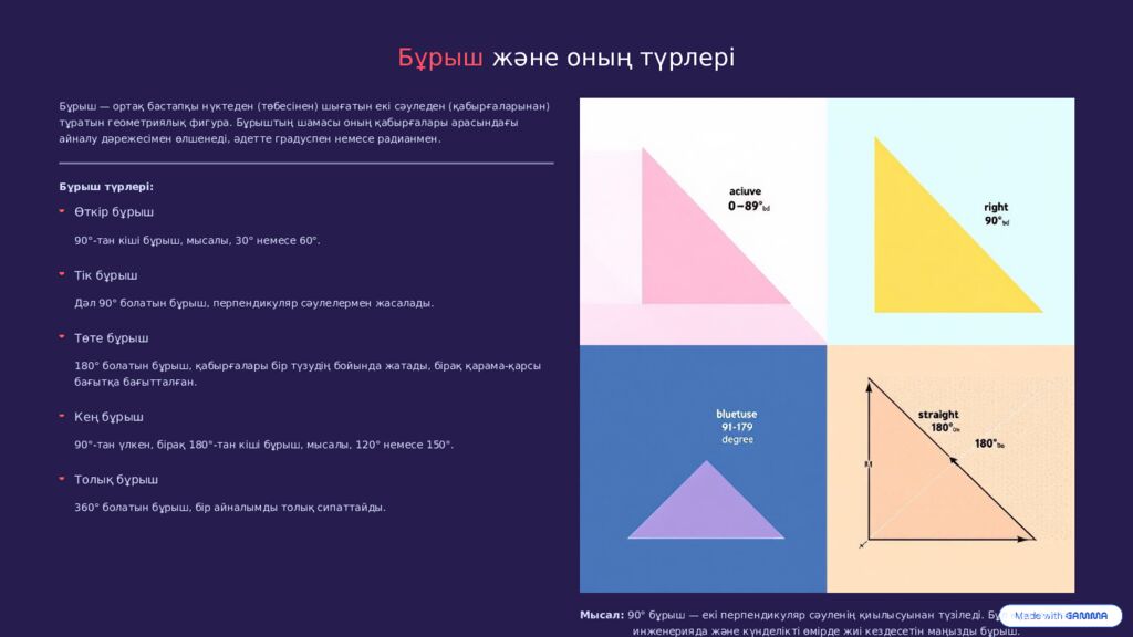 Бұрыш және оның түрлері Бұрыш — ортақ бастапқы нүктеден (төбесінен) шығатын екі сәуледен (қабырғаларынан) тұратын геометриялық фигура. Бұрыштың шамасы оның қабырғалары арасындағы айналу дәрежесімен өлшенеді, әдетте градуспен немесе радианмен. Бұрыш түрлері: Өткір бұрыш 90°-тан кіші бұрыш, мысалы, 30° немесе 60°. Тік бұрыш Дәл 90° болатын бұрыш, перпендикуляр сәулелермен жасалады. Төте бұрыш 180° болатын бұрыш, қабырғалары бір түзудің бойында жатады, бірақ қарама-қарсы бағытқа бағытталған. Кең бұрыш 90°-тан үлкен, бірақ 180°-тан кіші бұрыш, мысалы, 120° немесе 150°. Толық бұрыш 360° болатын бұрыш, бір айналымды толық сипаттайды. Мысал: 90° бұрыш — екі перпендикуляр сәуленің қиылысуынан түзіледі. Бұл құрылыста, инженерияда және күнделікті өмірде жиі кездесетін маңызды бұрыш.
