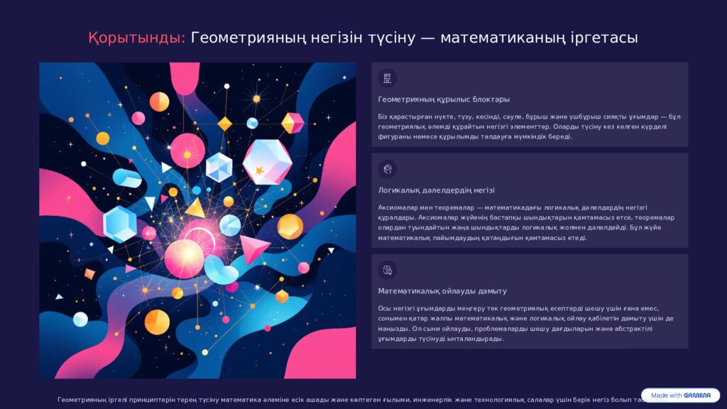 Қорытынды: Геометрияның негізін түсіну — математиканың іргетасы Геометрияның құрылыс блоктары Біз қарастырған нүкте, түзу, кесінді, сәуле, бұрыш және үшбұрыш сияқты ұғымдар — бұл геометриялық әлемді құрайтын негізгі элементтер. Оларды түсіну кез келген күрделі фигураны немесе құрылымды талдауға мүмкіндік береді. Логикалық дәлелдердің негізі Аксиомалар мен теоремалар — математикадағы логикалық дәлелдердің негізгі құралдары. Аксиомалар жүйенің бастапқы шындықтарын қамтамасыз етсе, теоремалар олардан туындайтын жаңа шындықтарды логикалық жолмен дәлелдейді. Бұл жүйе математикалық пайымдаудың қатаңдығын қамтамасыз етеді. Математикалық ойлауды дамыту Осы негізгі ұғымдарды меңгеру тек геометриялық есептерді шешу үшін ғана емес, сонымен қатар жалпы математикалық және логикалық ойлау қабілетін дамыту үшін де маңызды. Ол сыни ойлауды, проблемаларды шешу дағдыларын және абстрактілі ұғымдарды түсінуді ынталандырады. Геометрияның іргелі принциптерін терең түсіну математика әлеміне есік ашады және көптеген ғылыми, инженерлік және технологиялық салалар үшін берік негіз болып табылады.