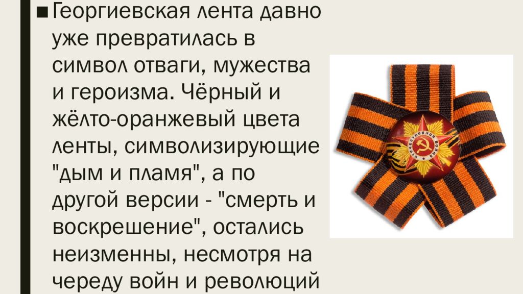 Георгиевская лента давно уже превратилась в символ отваги, мужества и героизма. Чёрный и жёлто-оранжевый цвета ленты, символизирующие "дым и пламя", а по другой версии - "смерть и воскрешение", остались неизменны, несмотря на череду войн и революций