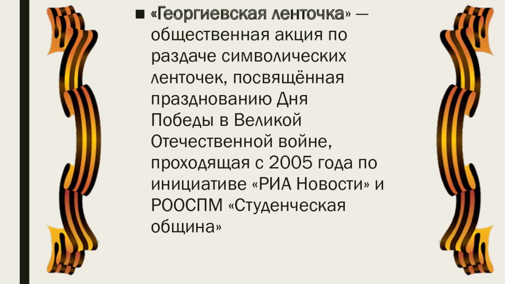 «Георгиевская ленточка » — общественная акция по раздаче символических ленточек, посвящённая празднованию Дня Победы в Великой Отечественной войне, проходящая с 2005 года по инициативе «РИА Новости» и РООСПМ «Студенческая община»