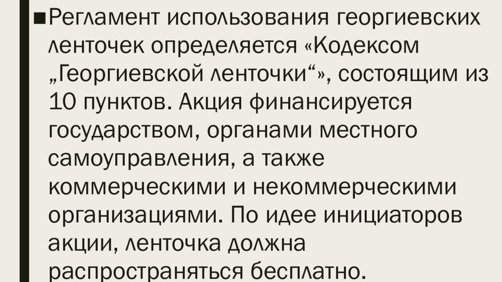 Регламент использования георгиевских ленточек определяется «Кодексом „Георгиевской ленточки“», состоящим из 10 пунктов. Акция финансируется государством, органами местного самоуправления, а также коммерческими и некоммерческими организациями. По идее инициаторов акции, ленточка должна распространяться бесплатно.