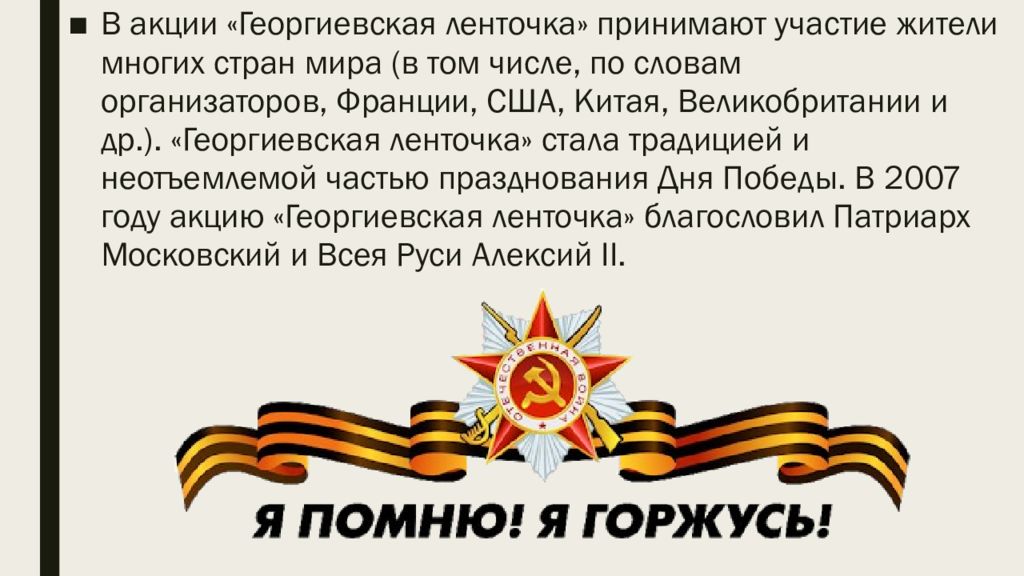 В акции «Георгиевская ленточка» принимают участие жители многих стран мира (в том числе, по словам организаторов, Франции, США, Китая, Великобритании и др.). «Георгиевская ленточка» стала традицией и неотъемлемой частью празднования Дня Победы. В 2007 году акцию «Георгиевская ленточка» благословил Патриарх Московский и Всея Руси Алексий II.