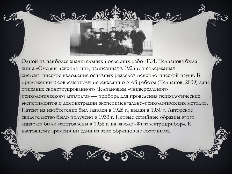 Одной из наиболее значительных последних работ Г.И. Челпанова была книга «Очерки психологии», написанная в 1926 г. и содержащая систематическое изложение основных разделов психологической науки. В приложении к современному переизданию этой работы (Челпанов, 2009) дано описание сконструированного Челпановым «универсального психологического аппарата» — прибора для проведения психологических экспериментов и демонстрации экспериментально-психологических методов. Патент на изобретение был заявлен в 1926 г., выдан в 1930 г. Авторское свидетельство было получено в 1933 г. Первые серийные образцы этого аппарата были изготовлены в 1936 г. на заводе « Физэлектроприбор ». К настоящему времени ни один из этих образцов не сохранился.