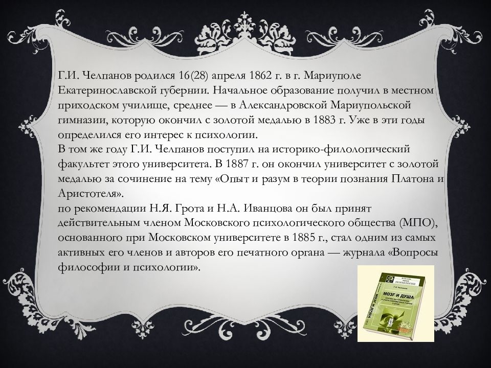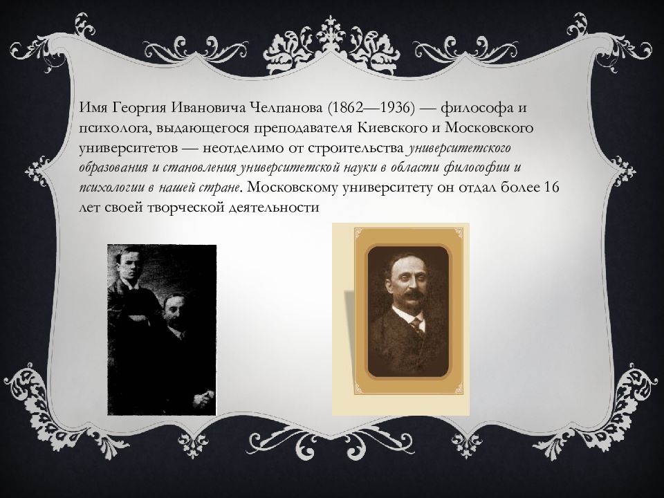 Имя Георгия Ивановича Челпанова (1862—1936) — философа и психолога, выдающегося преподавателя Киевского и Московского университетов — неотделимо от строительства университетского образования и становления университетской науки в области философии и психологии в нашей стране. Московскому университету он отдал более 16 лет своей творческой деятельности