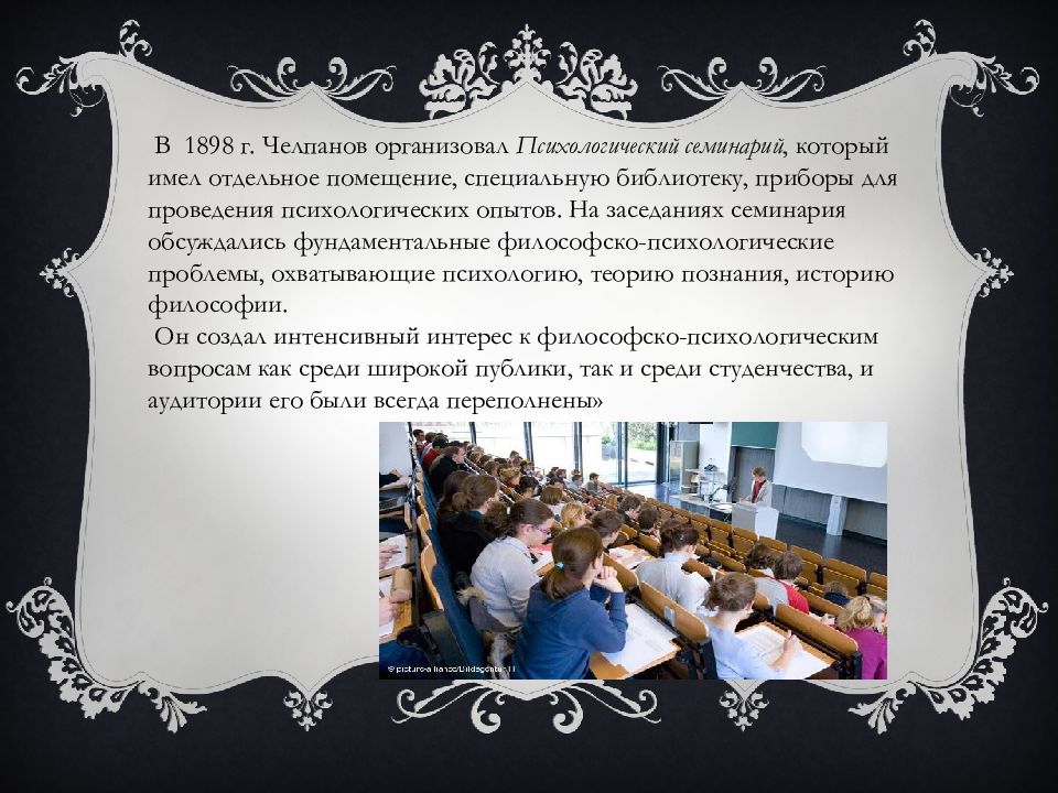 В 1898 г. Челпанов организовал Психологический семинарий, который имел отдельное помещение, специальную библиотеку, приборы для проведения психологических опытов. На заседаниях семинария обсуждались фундаментальные философско-психологические проблемы, охватывающие психологию, теорию познания, историю философии. Он создал интенсивный интерес к философско-психологическим вопросам как среди широкой публики, так и среди студенчества, и аудитории его были всегда переполнены»