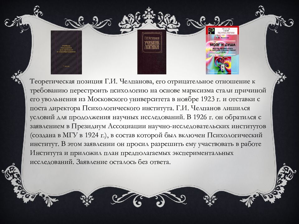 Теоретическая позиция Г.И. Челпанова, его отрицательное отношение к требованию перестроить психологию на основе марксизма стали причиной его увольнения из Московского университета в ноябре 1923 г. и отставки с поста директора Психологического института. Г.И. Челпанов лишился условий для продолжения научных исследований. В 1926 г. он обратился с заявлением в Президиум Ассоциации научно-исследовательских институтов (создана в МГУ в 1924 г.), в состав которой был включен Психологический институт. В этом заявлении он просил разрешить ему участвовать в работе Института и приложил план предполагаемых экспериментальных исследований. Заявление осталось без ответа.