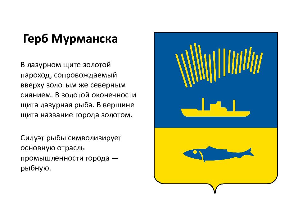 В лазурном щите золотой пароход, сопровождаемый вверху золотым же северным сиянием. В золотой оконечности щита лазурная рыба. В вершине щита название города золотом. Силуэт рыбы символизирует основную отрасль промышленности города — рыбную.