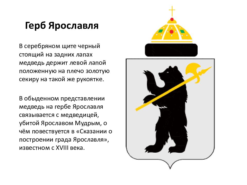 В серебряном щите черный стоящий на задних лапах медведь держит левой лапой положенную на плечо золотую секиру на такой же рукоятке. В обыденном представлении медведь на гербе Ярославля связывается с медведицей, убитой Ярославом Мудрым, о чём повествуется в «Сказании о построении града Ярославля», известном с XVIII века.