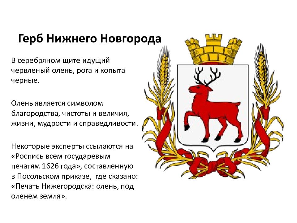 В серебряном щите идущий червленый олень, рога и копыта черные. Олень является символом благородства, чистоты и величия, жизни, мудрости и справедливости. Некоторые эксперты ссылаются на «Роспись всем государевым печатям 1626 года», составленную в Посольском приказе, где сказано : «Печать Нижегородска : олень, под оленем земля».